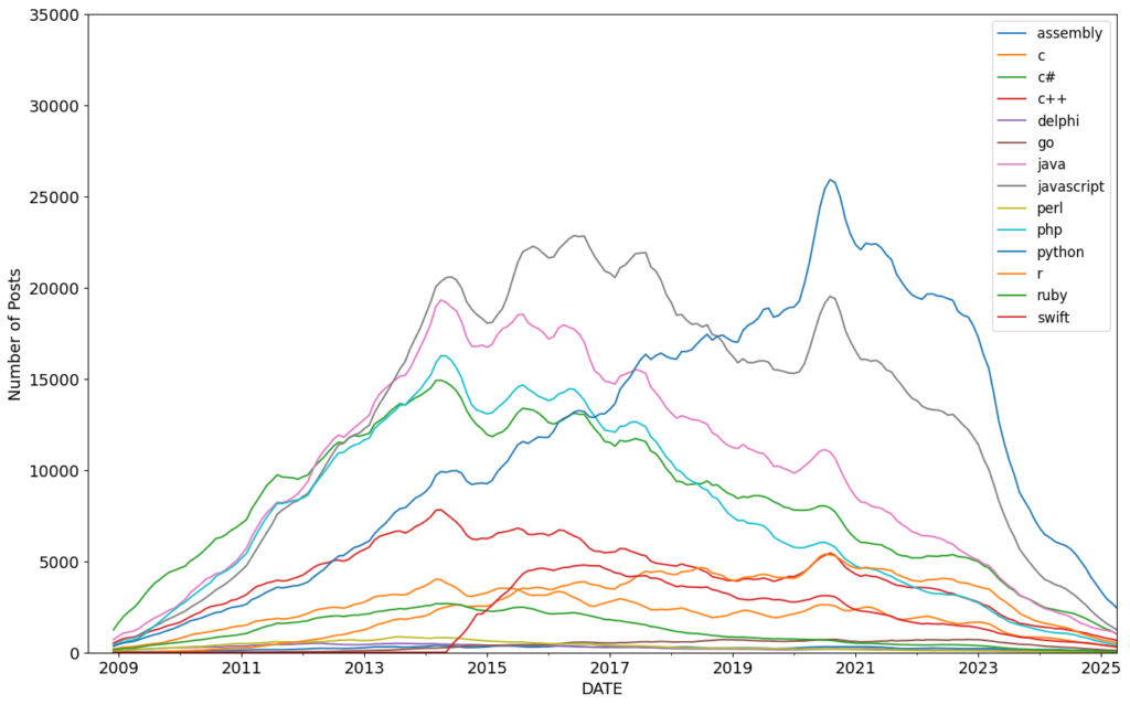 Stack Overflow’s traffic data tells the story clearly. Programming language search traffic dropped sharply in 2022 – not because the languages got less popular, but because ChatGPT became popular. Agents replaced humans as the primary consumers of technical information. The same shift is coming for every data-rich website.