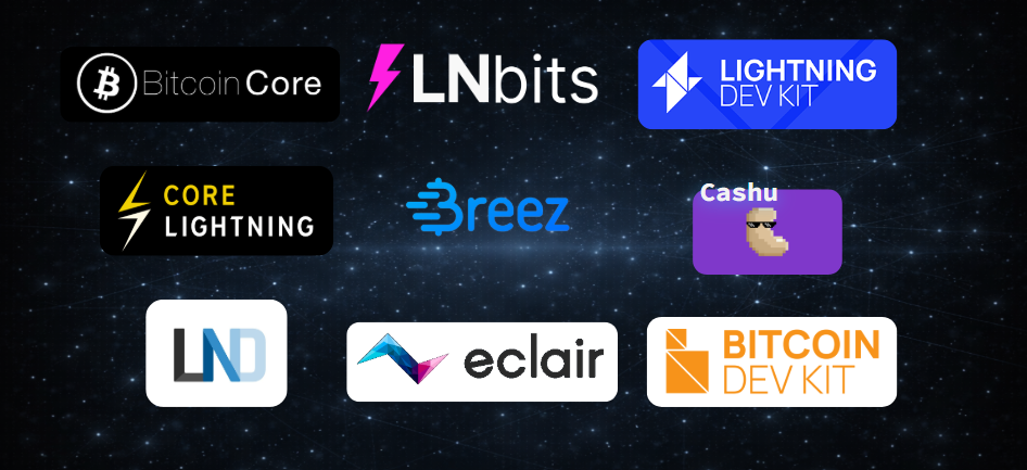 Tools: Bitcoin Core, LND, Core Lightning, Eclair, Voltage, Amboss